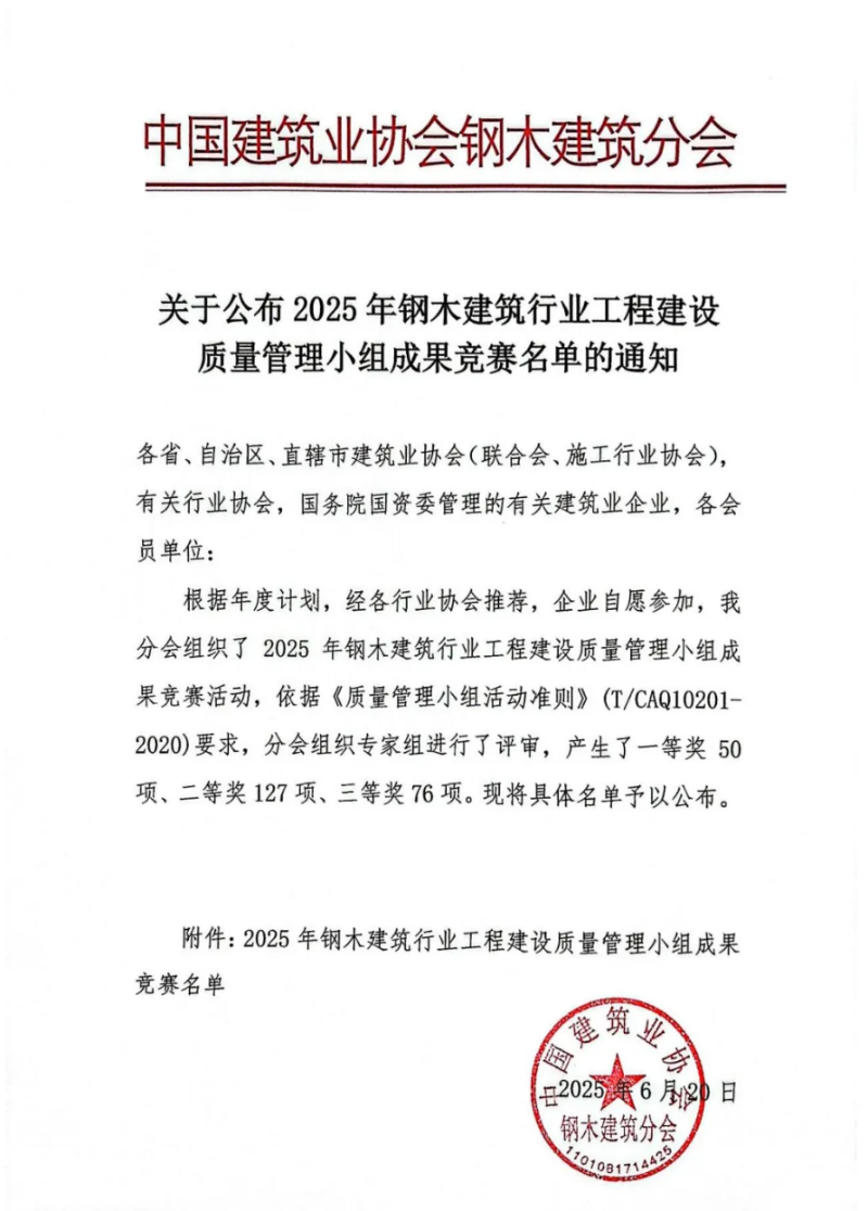 近日,在中國建筑業(yè)協(xié)會(huì)鋼木建筑分會(huì)主辦的2025年鋼木建筑行業(yè)工程建設(shè)質(zhì)量管理小組成果競賽中,中建材鋼構(gòu)公司憑借卓越的質(zhì)量管理成果和創(chuàng)新實(shí)踐,一舉斬獲多項(xiàng)榮譽(yù),充分彰顯了其在行業(yè)內(nèi)的領(lǐng)先地位和綜合實(shí)力。